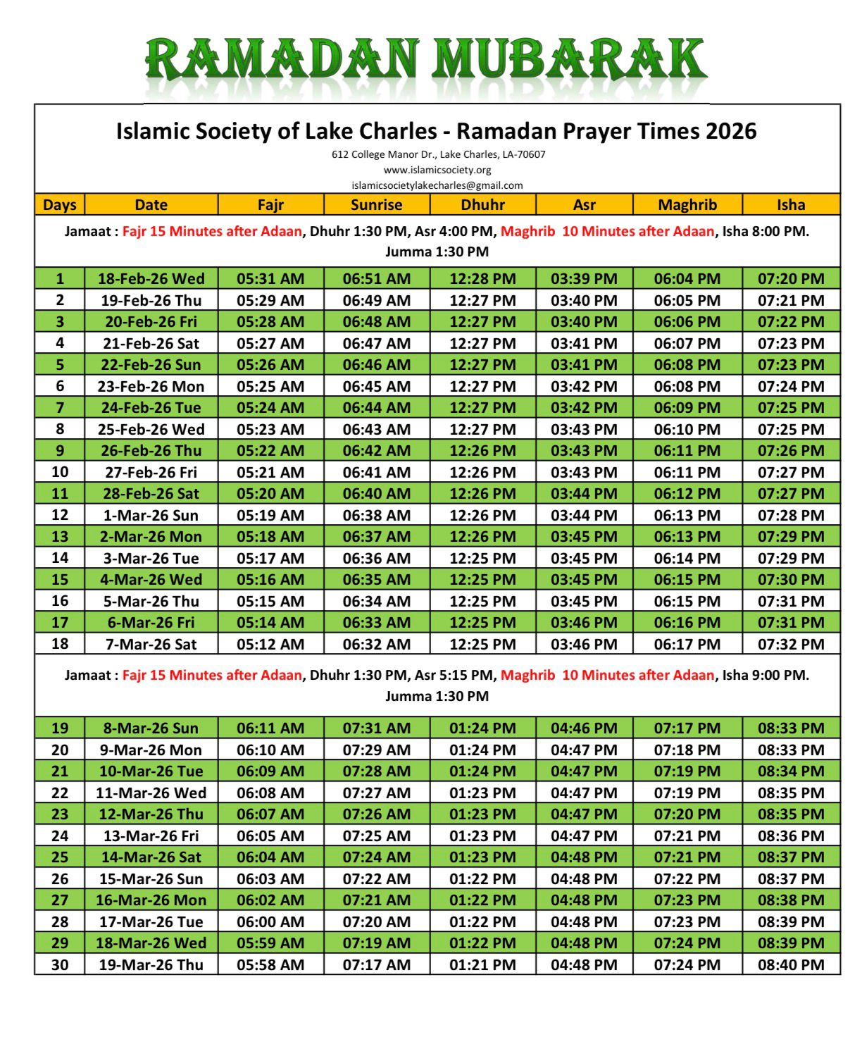 February prayer times Isha 7:45 starting January 16. Ramadan schedule expected 18th isA – see schedule bottom of page. The ISLC Community is open for five daily prayers in the masjid. Please fulfill your obligation to attend daily salaat in congregation as well as arriving early before 1:30pm for Friday Jummah. Please adhere to all parking guidelines and self-monitor health before coming to the m